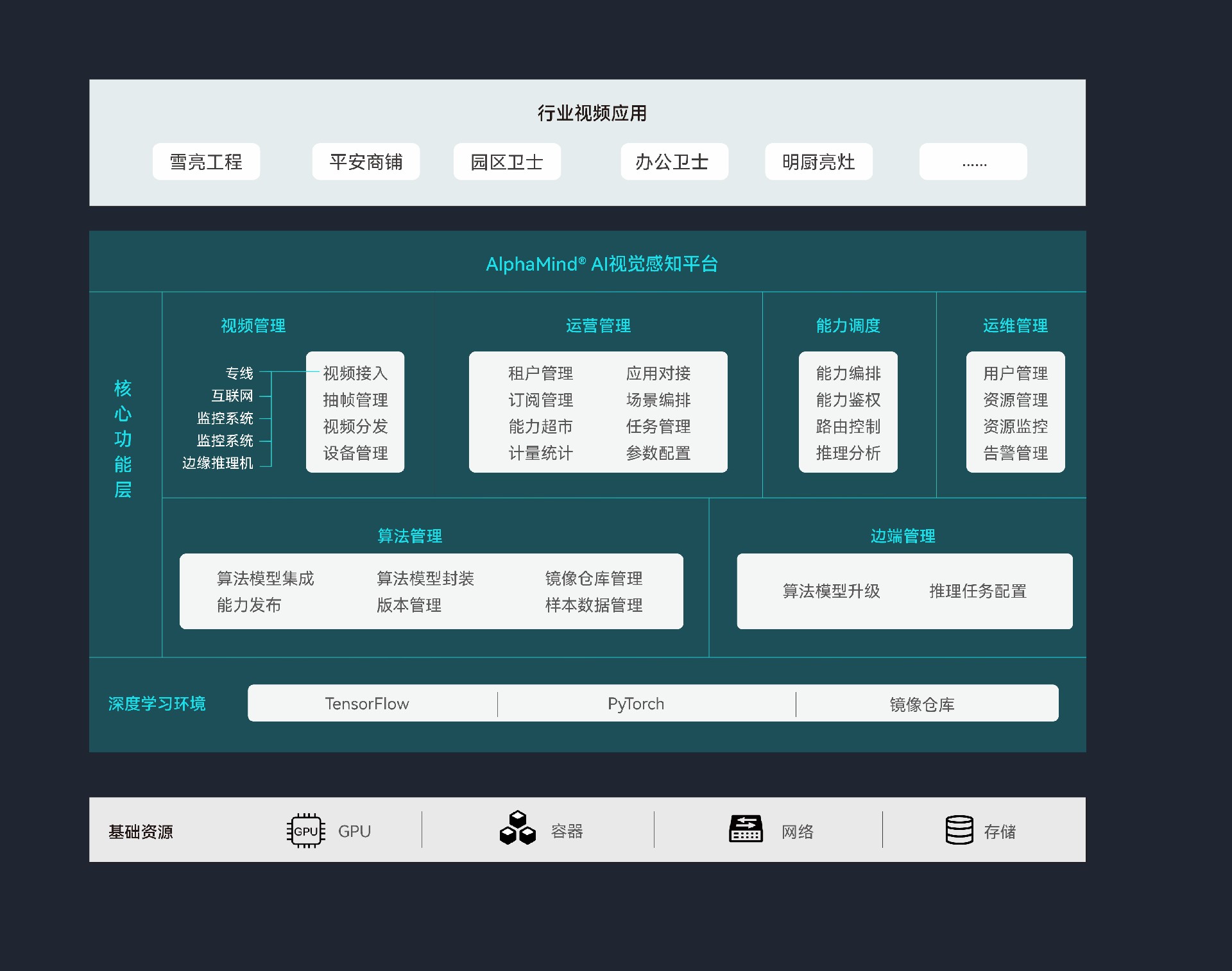 AlphaMind? AI視覺感知平臺包括深度學(xué)習(xí)環(huán)境和核心功能層兩部分,是云原生、容器化架構(gòu)的平臺,它對視頻AI能力進(jìn)行統(tǒng)一匯聚、封裝、調(diào)度,支持算法本地部署和遠(yuǎn)程調(diào)用方式,支持云邊視頻智能分析模式。